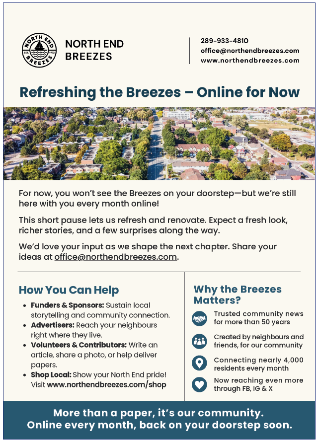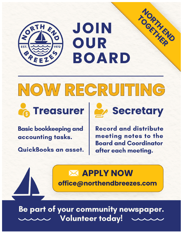There’s still a need for a secretary and a treasurer if you want to join our Board of Directors. It's not a huge time commitment; one meeting per month for two hours. The Board is looking at restructuring and firming up policies and procedures so perhaps your work or life experience would be an asset. It’s a great way to help out in a different way. Please send a resume outlining your skills to office@northendbreezes.com