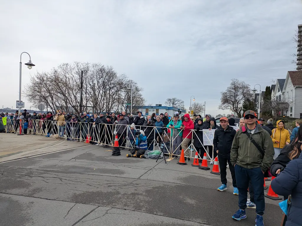 By the time runners returned to the finish area later in the morning and into the afternoon, the space around Pier 8 was loud and full of energy. People were cheering, whistling, calling out names, and using horns. Signs stayed up as people watched for familiar faces coming in.