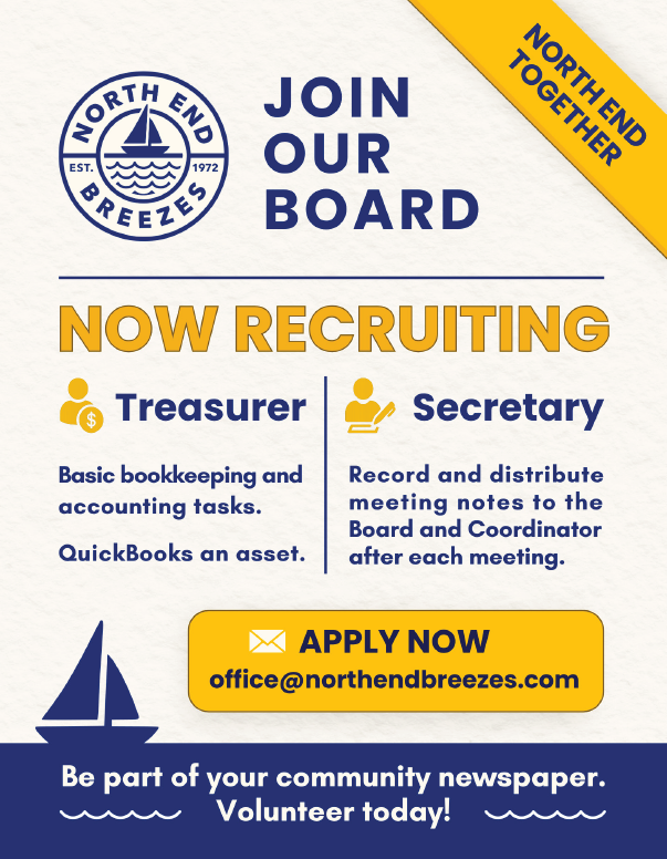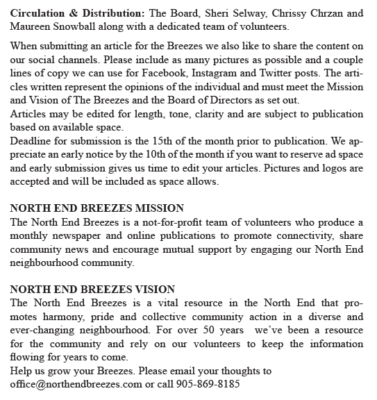 What you see today started over 50 years ago with the vision of a North End resident. Eva Googe wanted to start a small paper to keep the community informed about events. This was the beginning of North End Information Services which has since morphed into what we now know as The North End Breezes. It was all printed on a Gestetner which had to be hand cranked. Over the years, she grew the paper to meet the needs of the community.