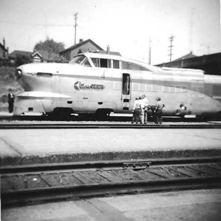 Pictured is my grandfather William G. (Puffy Billy) Arnold, Station Master of the James Street CNR station. This is one of the first ultramodern, streamlined, diesel engines.