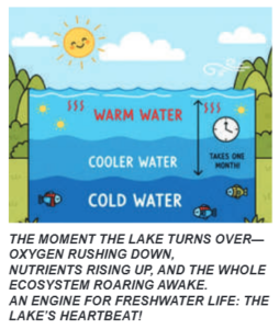 A Deep Breath for the Lake! Most aquatic animals— like trout and salmon, and even frogs—need oxygen to survive. In winter the deep water is sealed off from the air above, and its oxygen supply slowly and dangerously runs low. Turnover brings a huge rush of oxygen‑rich water from the surface down to the depths. It refreshes the deep zone and stops it from becoming a “dead zone” where nothing can live. The lake is taking a giant, rejuvenating breath! Rowr! And that’s no small roar, my friends!